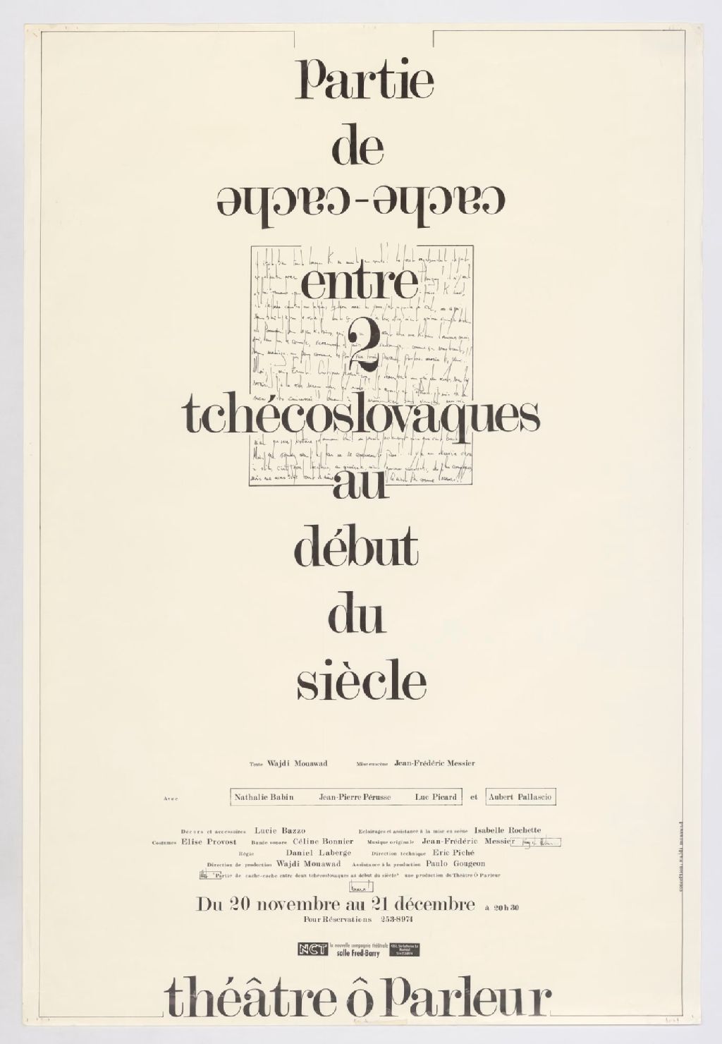 Partie de cache-cache entre 2 tchécoslovaques au début du siècle, texte Wajdi Mouawad, mise en scène Jean-Frédéric Messier avec Nathalie Babin, Jean-Pierre Pérusse, Luc Picard ...