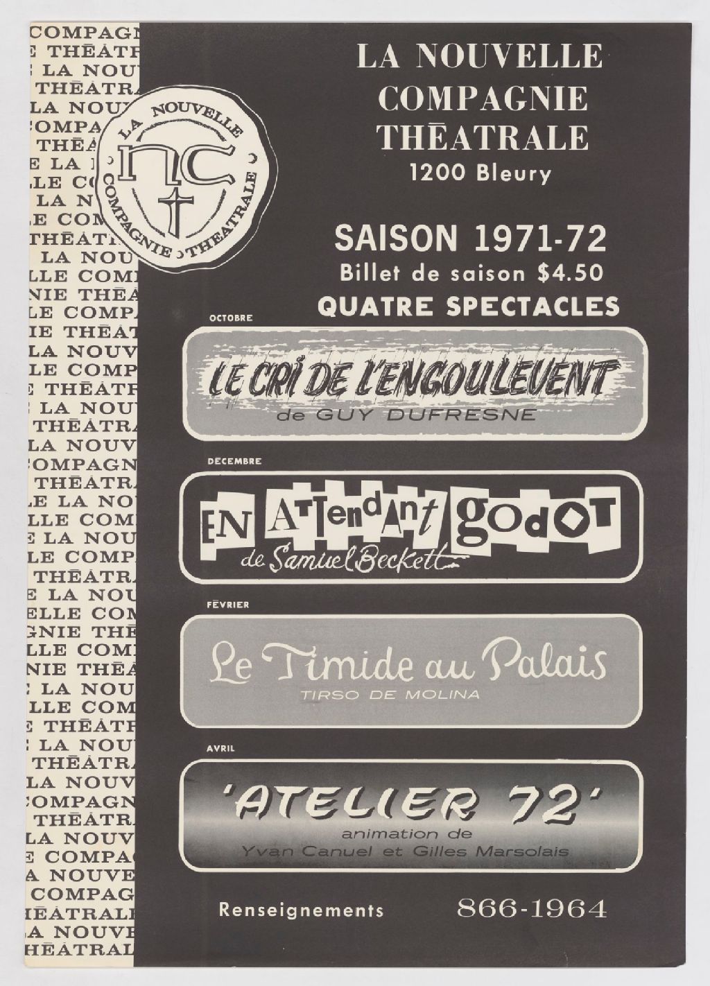 La Nouvelle Compagnie théâtrale, 1200 Bleury, saison 1971-72 ... quatre spectacles : octobre, Le cri de l'engoulevent, de Guy Dufresne - février, En attendant Godot, de Samuel Beckett - février, Le timide au palais, Tirso de Molina - avril, "Atelier 72", animation de Yvan Canuel et Gilles Marsolais