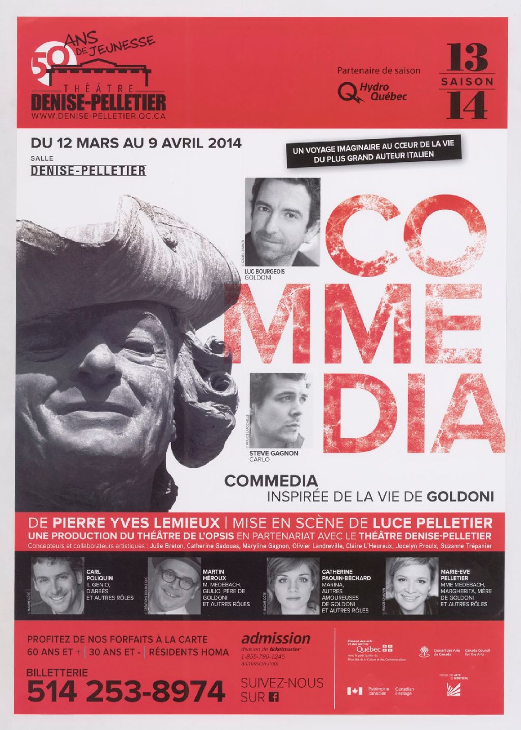 Commedia, inspirée de la vie de Goldoni : du 12 mars au 9 avril 2014, salle Denise Pelletier : un voyage imaginaire au cœur de la vie du plus grand auteur italien : de Pierre Yves Lemieux, mise en scène de Luce Pelletier, une production du Théâtre de l'Opsis en partenariat ave le Théâtre Denise-Pelletier