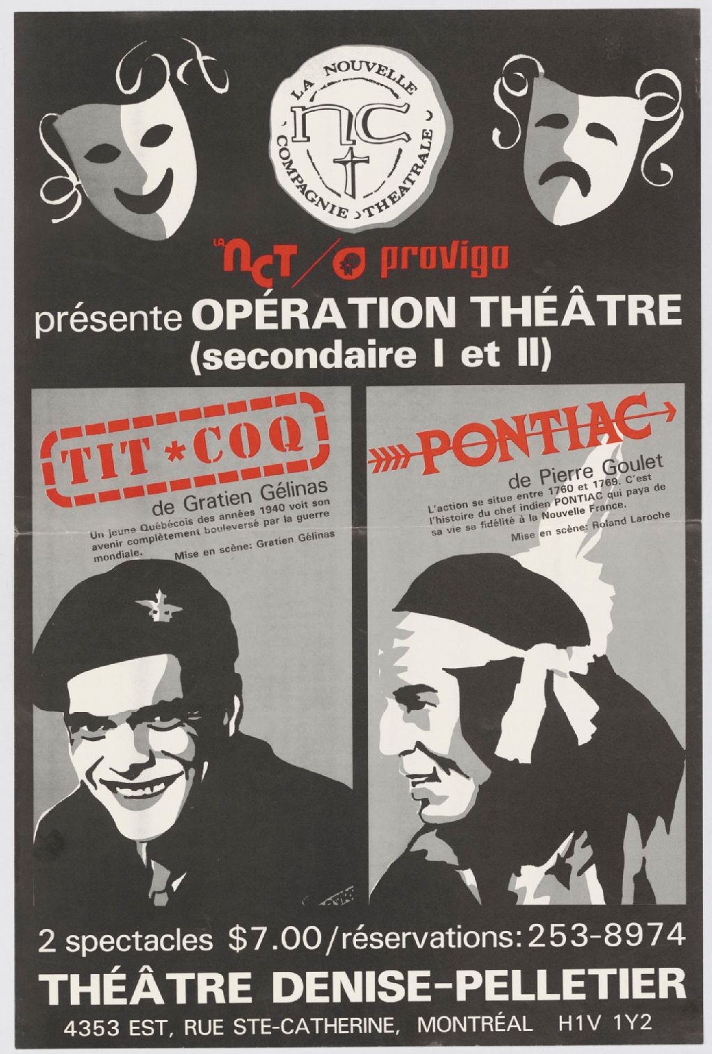La NCT/ Provigo présente Opération théâtre (secondaire I et II) Tit-Coq, de Gratien Gélinas ... Pontiac, de Pierre Goulet ...