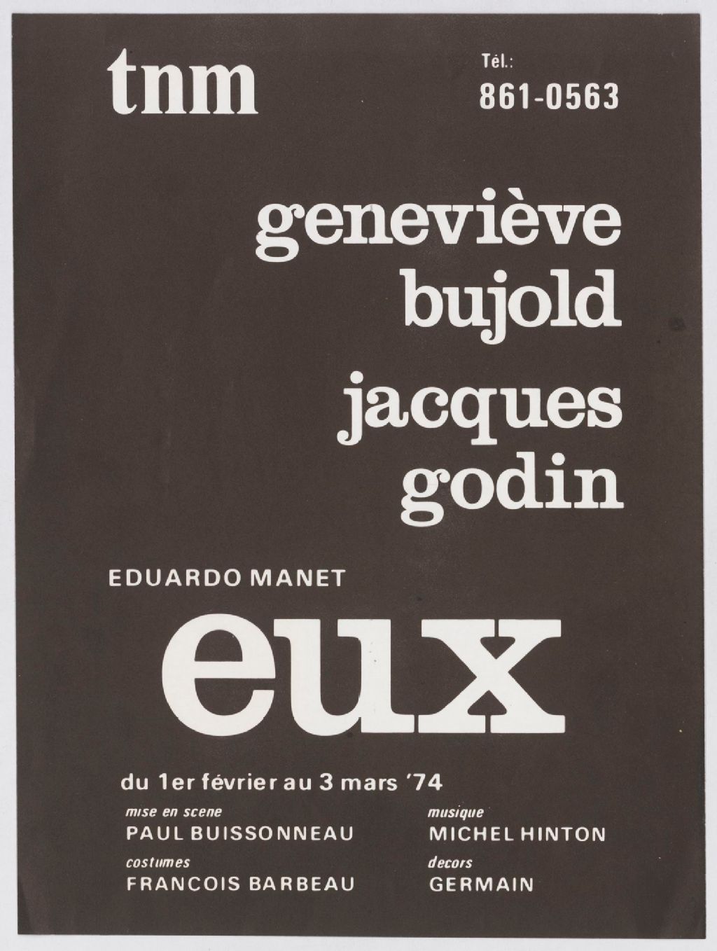 Eux, Eduardo Manet : TNM, Geneviève Bujold, Jacques Godin : du 1er février au 3 mars '74 ...