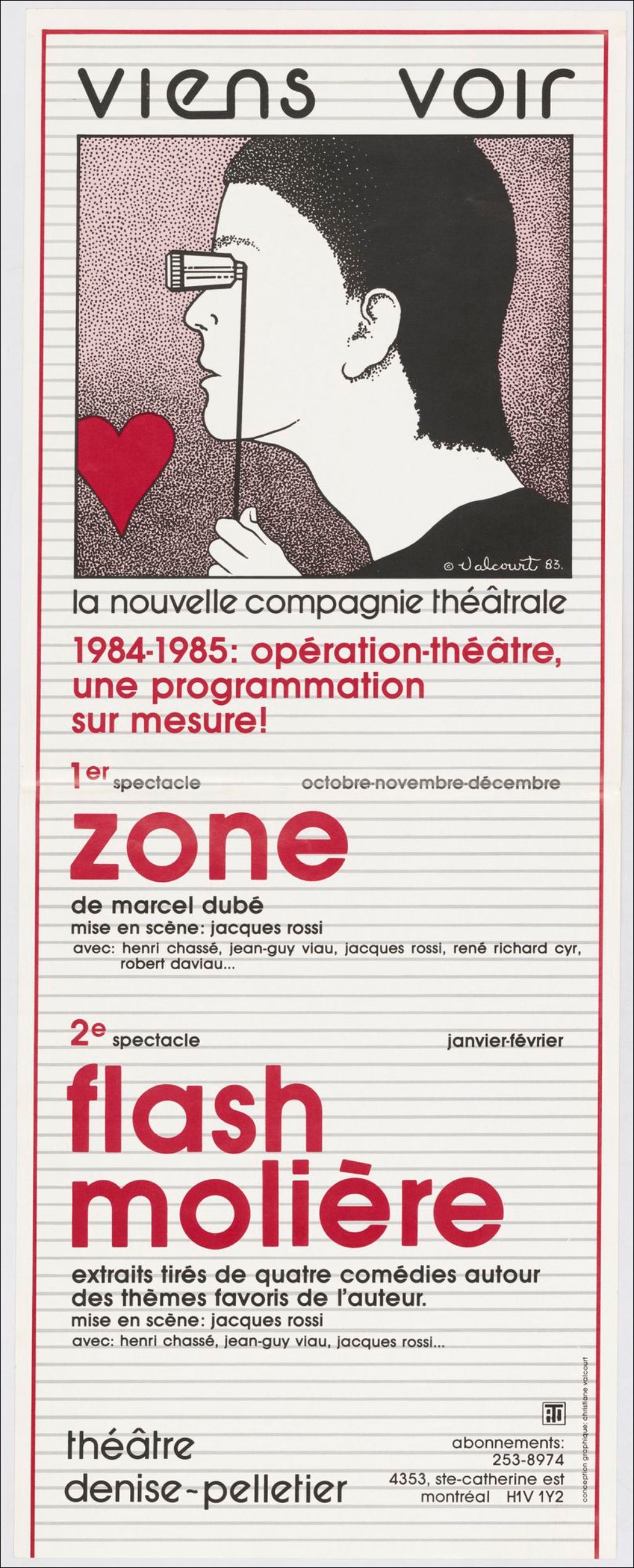 Viens voir la Nouvelle Compagnie théâtrale : 1984-1985, opération-théâtre, une programmation sur mesure! : 1er spectacle (octobre-novembre-décembre), Zone, de Marcel Dubé ... 2e spectacle (janvier-février), Flash Molière, extraits tirés de quatre comédies autour des thèmes favories de l'auteur ... théâtre Denise-Pelletier /