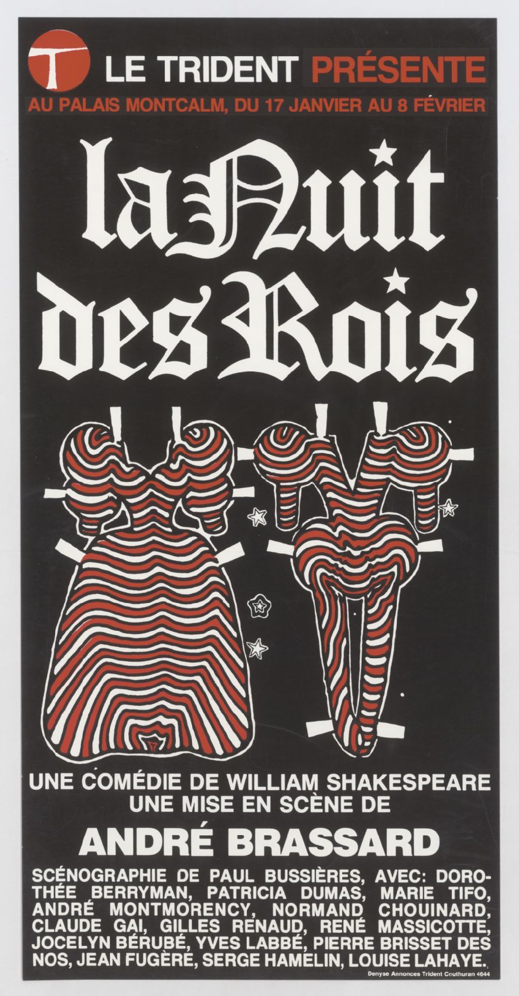 Le Trident présente au Palais Montcalm du 17 janvier au 8 février La nuit des rois, une comédie de William Shakespeare, une mise en scène de André Brassard : scénographie de Paul Bussières, avec Dorothée Berryman, Patricia Dumas, Marie Tifo ...
