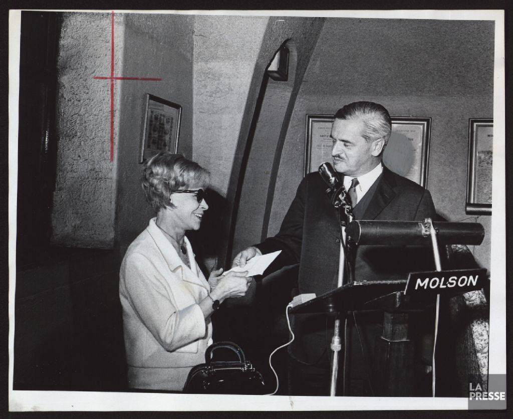 - Un document illustre Jovette Bernier recevant le prix du Cercle du livre de France en 1969 pour son livre "Non Monsieur". Elle reçoit ce prix des mains de Jean-Charles Bonenfant lors d'une réception à la Brasserie Molson