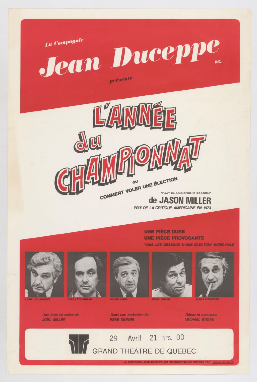 La Compagnie Jean Duceppe inc. présente L'année du championnat, ou, Comment voler une élection ("That championship season", de Jason Miller, prix de la critique américaine en 1973) une pièce dure, une pièce provocante, tous les dessous d'une élection municipale