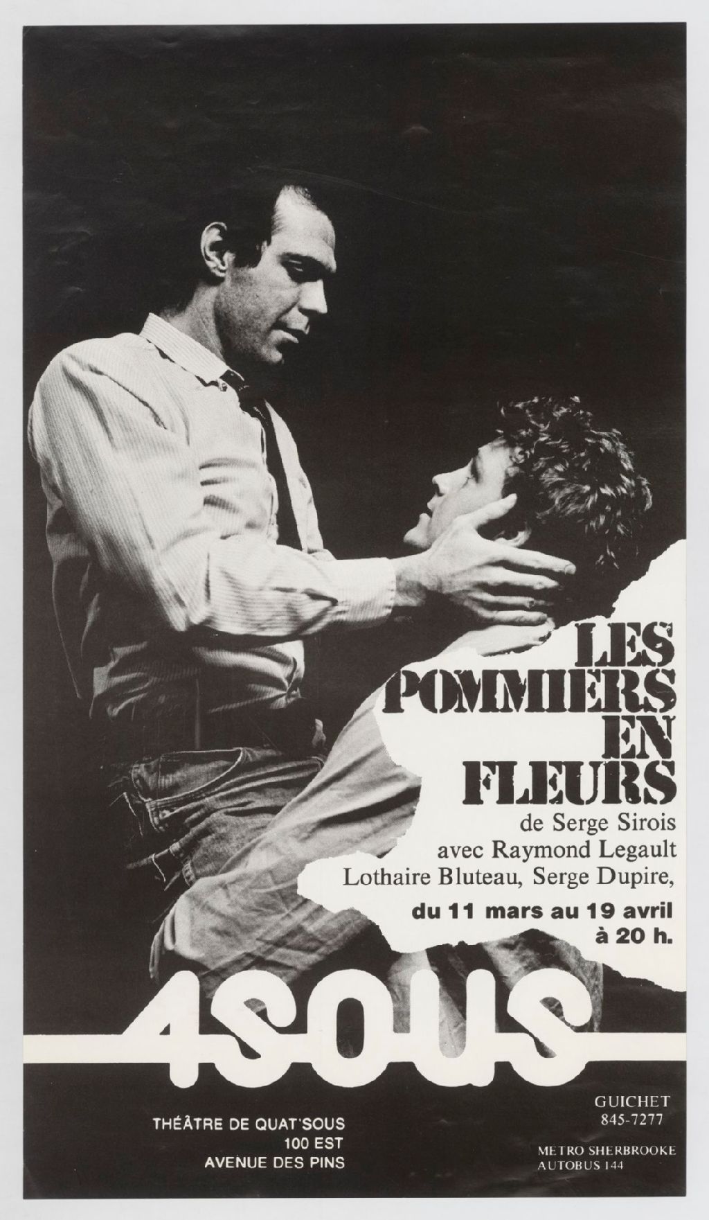 Les pommiers en fleurs : de Serge Sirois, avec Raymond Legault, Lothaire Bluteau, Serge Dupire : du 11 mars au 19 avril à 20 h.