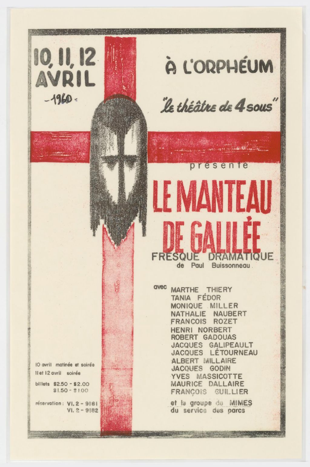 10, 11, 12 avril 1960 à l'Orphéum, "le Théâtre de 4 sous" présente Le manteau de Galilée : fresque dramatique de Paul Buissonneau : avec Marthe Thiéry, Tania Fédor, Monique Miller ...