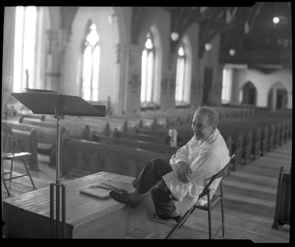 Le chef d'orchestre Wilfrid Pelletier dans la chapelle du Collège de Saint-Laurent, 1950, Archives nationales à Québec, Fonds Lida Moser, (03Q,P728,S1,D2,P13-9), Lida Moser.