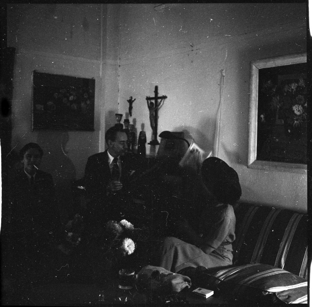 Photo prise lors d'une rencontre entre poètes, peintres et acteurs organisée par Paul Gouin et Jean Palardy, historien de l'art, au domicile de Palardy et de sa femme, la peintre Jori Smith
