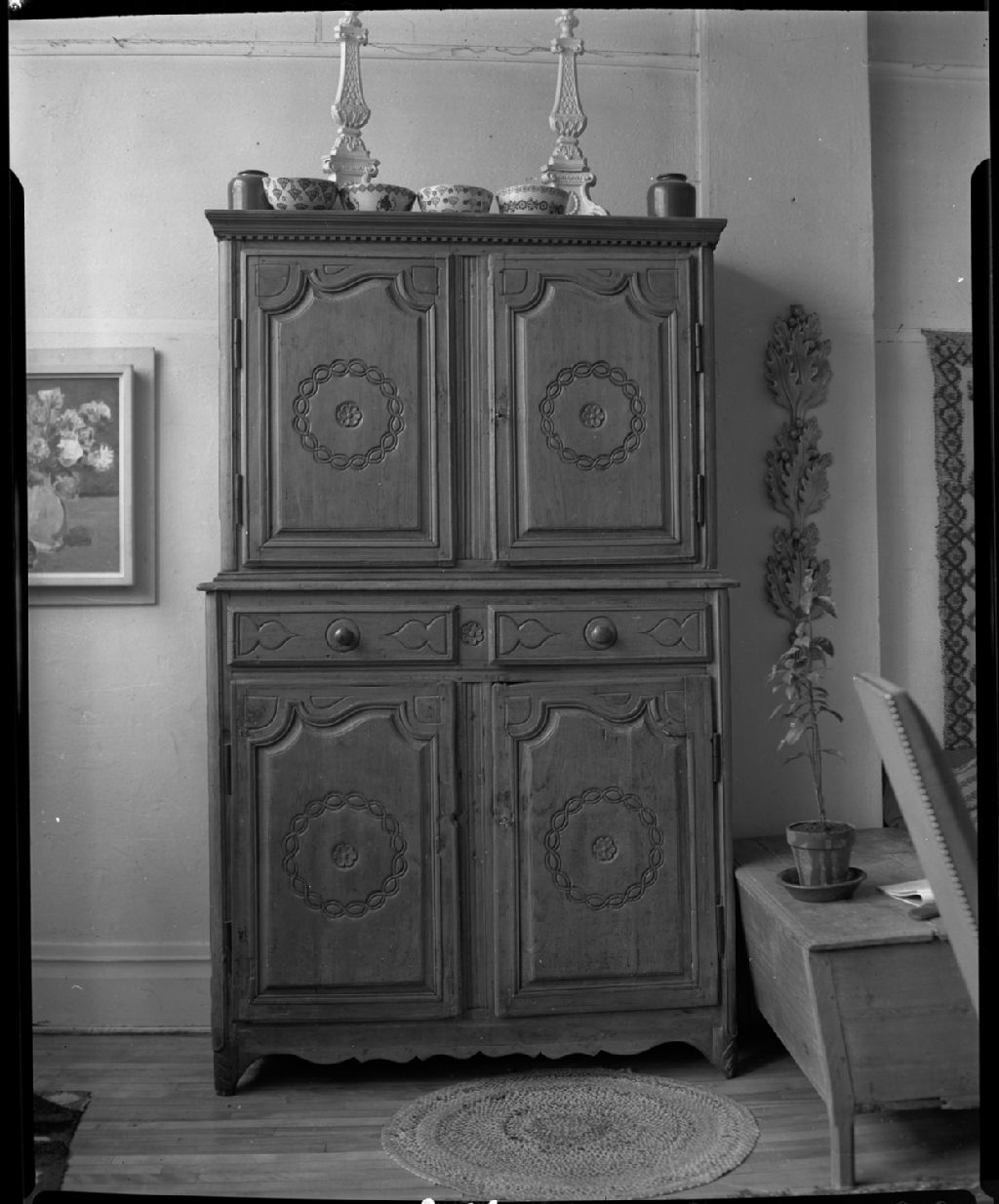 Une armoire en bois dans le salon de Jean Palardy et de Jori Smith, à La Prairie