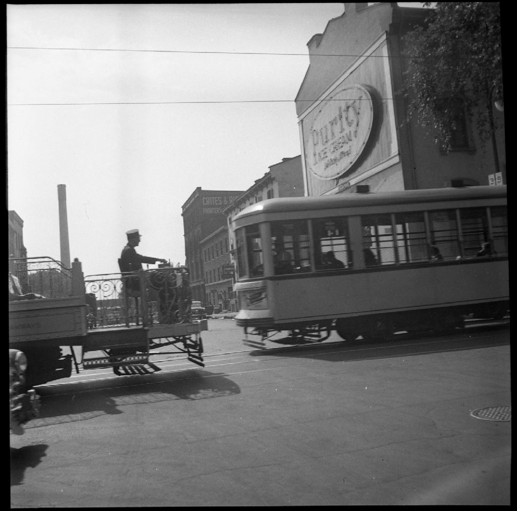 Deux modèles de tramway, l'un ouvert et l'autre fermé, se croisant à l'intersection des rues Dorchester (aujourd'hui René-Lévesque) et de la Montagne