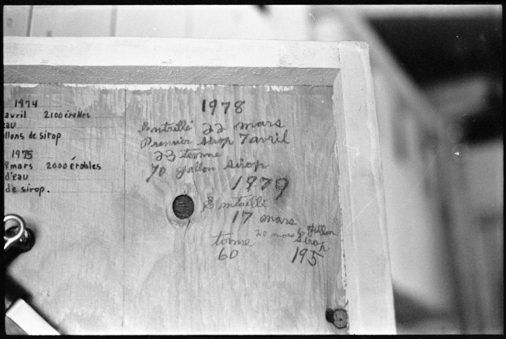 Porte d'armoire, mur ouest, pièce production, statistiques sur la production, 1981, Archives nationales à Québec, Fonds Guy Giguère, (03Q,P640,D10,P9), Guy Giguère.