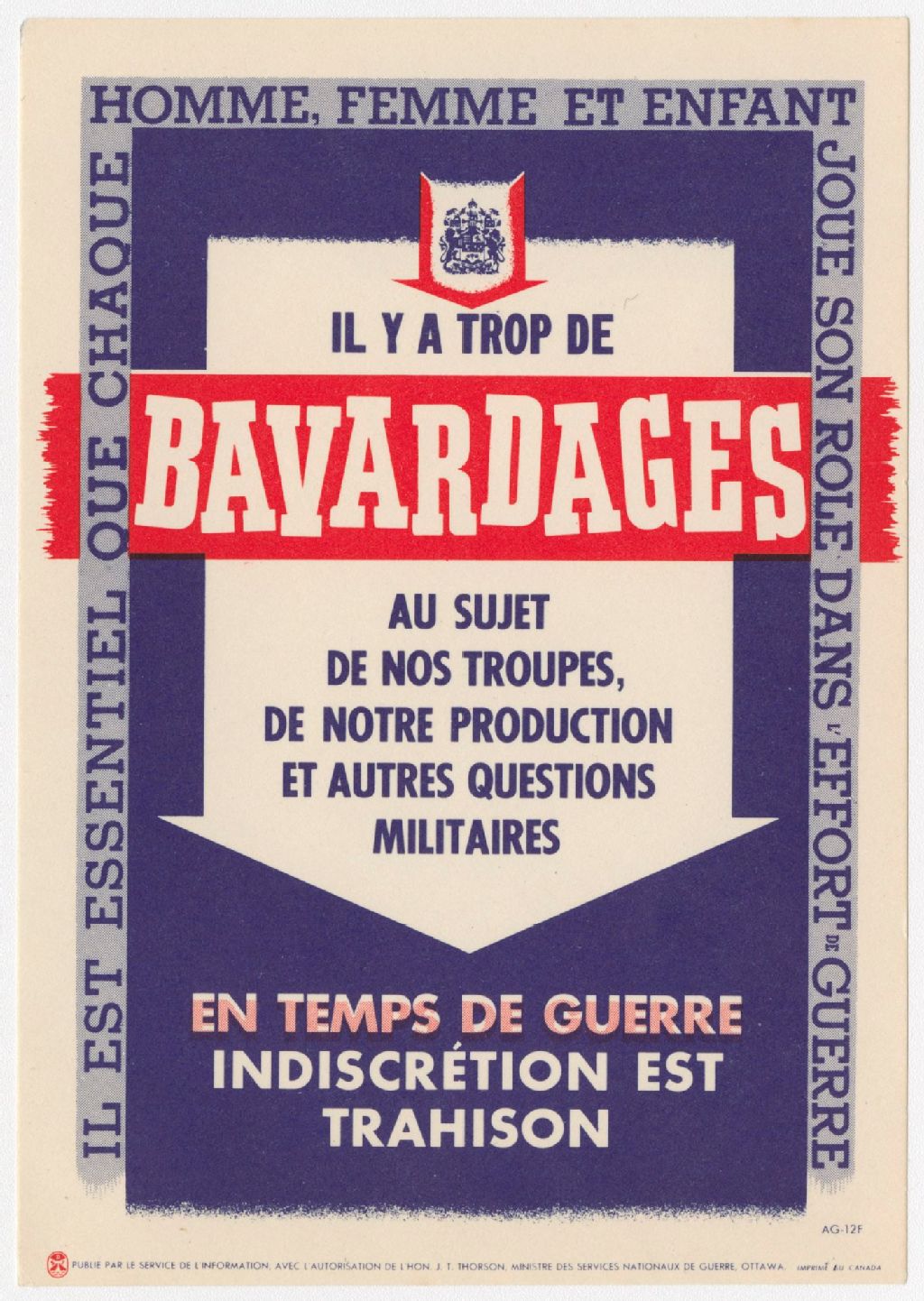 Il y a trop de bavardages au sujet de nos troupes, de notre production et autres questions militaires : en temps de guerre, indiscrétion est trahison : il est essentiel que chaque homme, femme et enfant joue son rôle dans l'effort de guerre