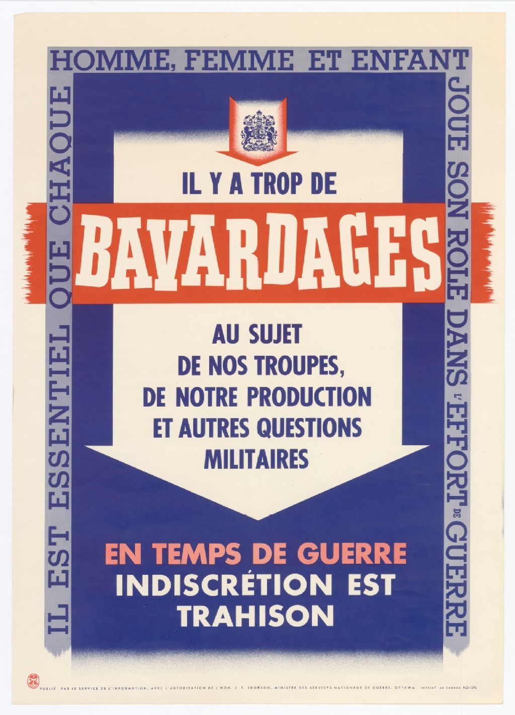 Il y a trop de bavardages au sujet de nos troupes, de notre production et autres questions militaires : en temps de guerre, indiscrétion est trahison : il est essentiel que chaque homme, femme et enfant joue son rôle dans l'effort de guerre