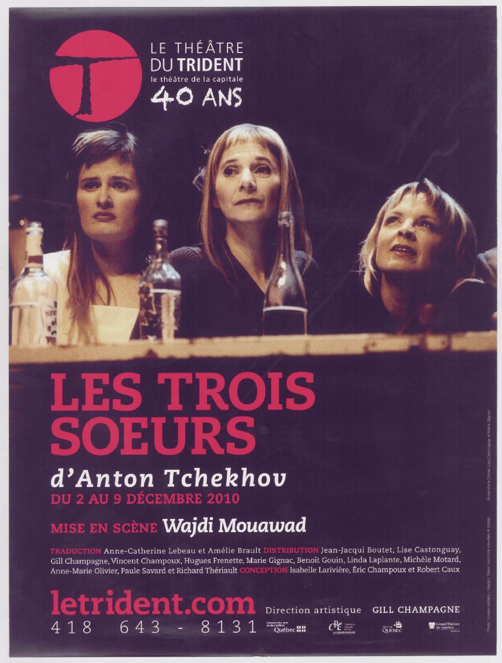 Les trois soeurs, d'Anton Tchekhov ... mise en scène Wajdi Mouawad, traduction Anne-Catherine Lebeau et Amélie Brault distribution Jean-Jacqui Boutet, Lise Castonguay, Gill Champagne ...