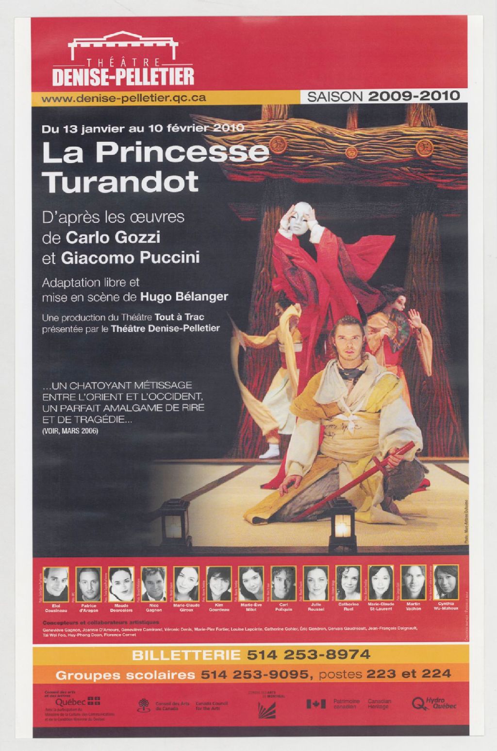 La princesse Turandot, d'après les œuvres de Carlo Gozzi et Giacomo Puccini, du 13 janvier au 10 février 2010 : adaptation libre et mise en scène de Hugo Bélanger, une production du Théâtre Tout à trac présentée par le Théâtre Denise-Pelletier /