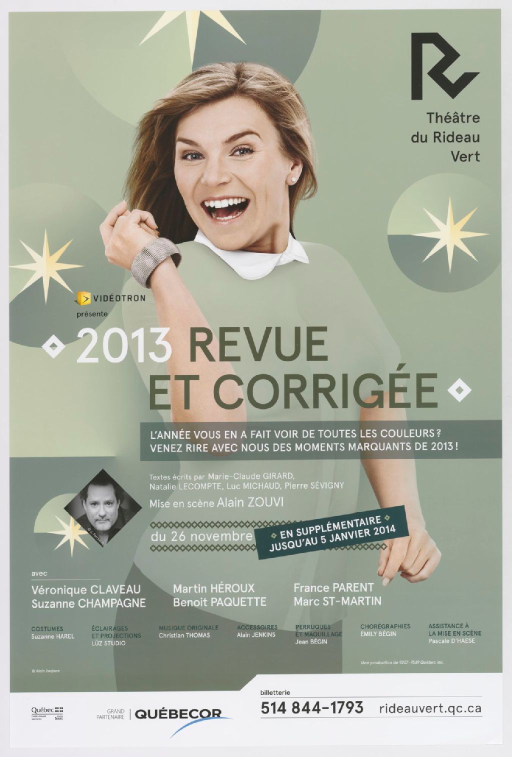 Vidéotron présente 2013, revue et corrigée : l'année vous en a fait voir de toutes les couleurs? Venez rire avec nous des moments marquants de 2013! : textes écrits par Marie-Claude Girard, Natalie Lecompte, Luc Michaud, Pierre Sévigny, mise en scène Alain Zouvi : en supplémentaire jusqu'au 5 janvier ...
