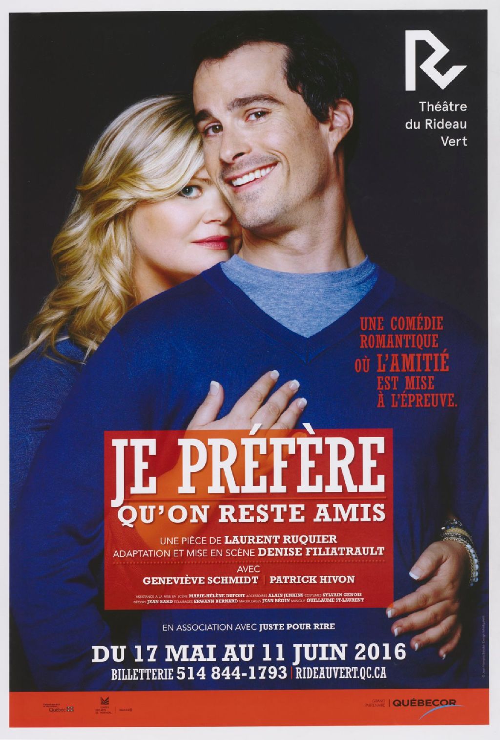 Je préfère qu'on reste amis, du 17 mai au 11 juin 2016 : une pièce de Laurent Ruquier, adaptation et mise en scène Denise Filiatrault : avec Geneviève Schmidt, Patrick Hivon ... /