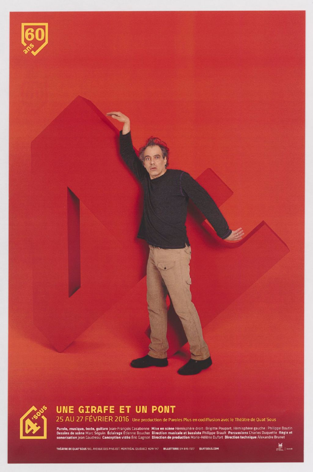 Une girafe et un pont : 25 au 27 février 2016, une production de Paroles Plus en codiffusion avec le Théâtre de Quat'sous : parole, musique, texte, guitare Jean-François Casabonne, mise en scène Hémisphère droit ...
