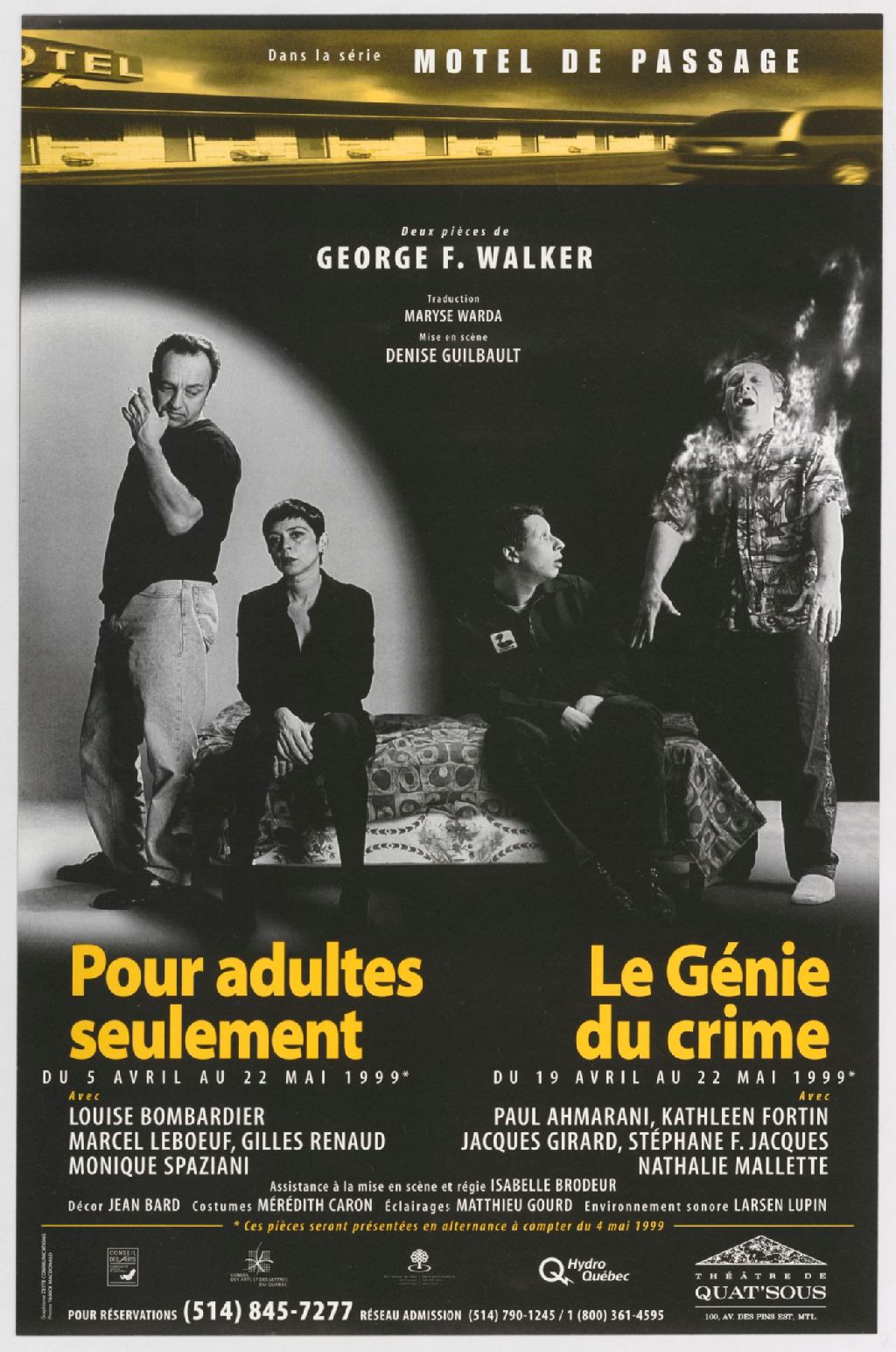 Pour adultes seulement, du 5 avril au 22 mai 1999, avec Louise Bombardier, Marcel Leboeuf, Gilles Renaud ... Le génie du crime, du 19 avril au 22 mai 1999, avec Paul Ahmarani, Kathleen Fortin, Jacques Girard ... : deux pièces de George F. Walker, traduction Maryse Warda, mise en scène Denise Guilbault /