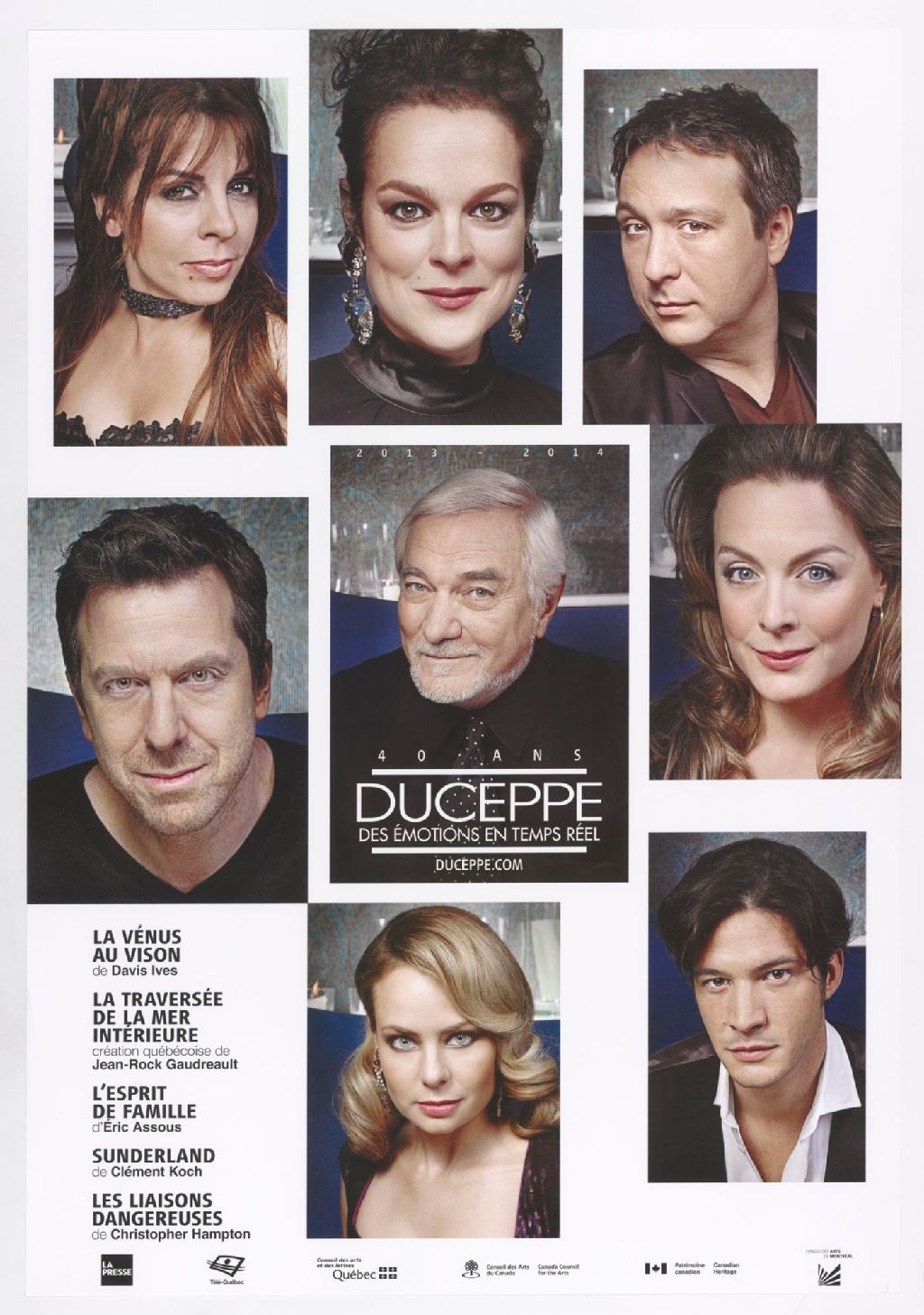 40 ans, Duceppe, des émotions en temps réel, duceppe.com, 2013-2014 : La vénus au vison, de Davis Ives - La traversée de la mer intérieure, création québécoise de Jean-Rock Gaudreault - L'esprit de famille, d'Éric Assous - Sunderland, de Clément Koch - Les liaisons dangereuses, de Christopher Hampton