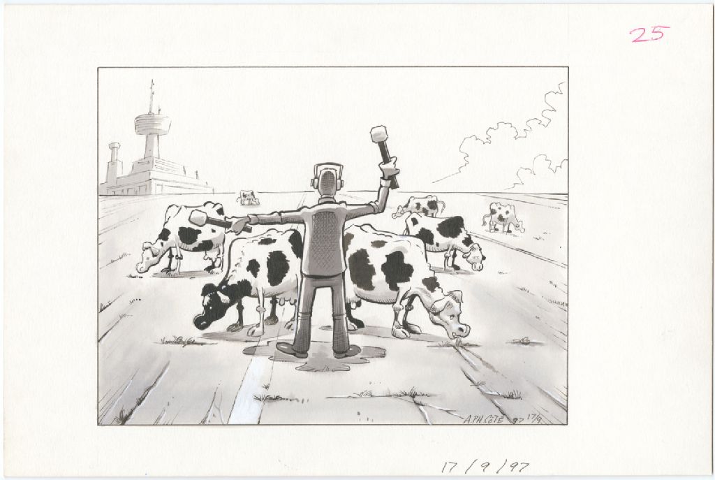 [Homme avec un casque d'écoute dans un champ de vaches et tient deux micros et fait signalisation comme à un aéroport], 17 septembre 1997, Archives nationales à Québec, Fonds André-Philippe Côté, (03Q,P687,S1,P97-09-17), André-Philippe Côté.