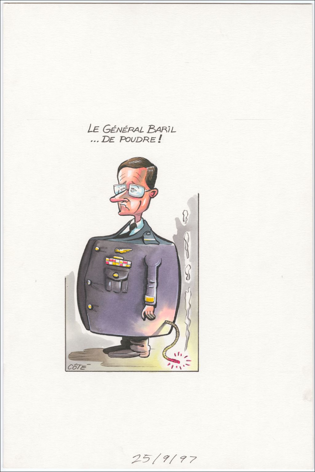 Le Général Baril… de poudre [Le Général Maurice Baril est en forme de baril et a une flammèche qui se prépare à exploser.], 25 septembre 1997, Archives nationales à Québec, Fonds André-Philippe Côté, (03Q,P687,S1,P97-09-25-1), André-Philippe Côté.
