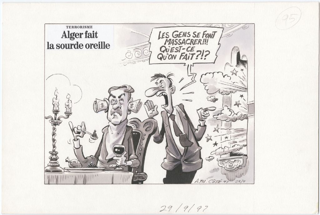 Terrorisme : Alger fait la sourde oreille [Homme en complet] : « Les gens se font massacrer !!! Qu'est-ce qu'on fait ?!? » [Un homme mange un repas assis à une table. Il a des billets de banque roulés dans les oreilles. L'homme en complet pointe une fenêtre où il semble avoir de la violence.]