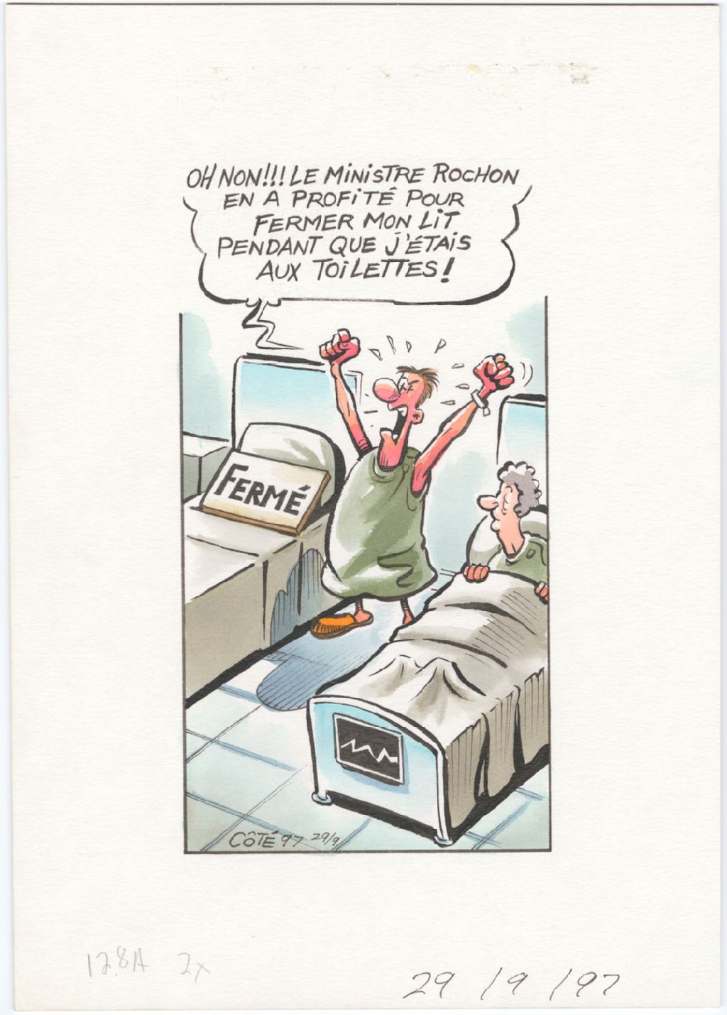 [Homme en jaquette d'hôpital] : « Oh non !!! Le ministre Rochon en a profité pour fermer mon lit pendant que j'étais aux toilettes ! » [Un homme et une femme sont dans une chambre d'hôpital avec deux lit. L'un des deux lit porte la mention « Fermé ».]