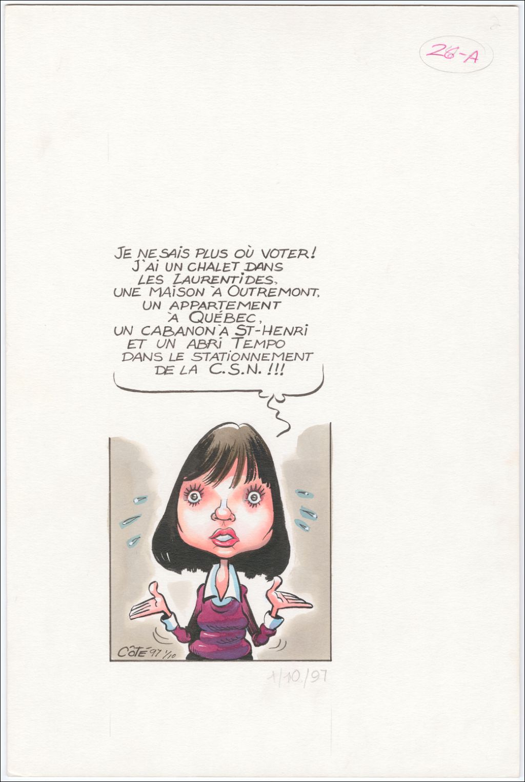 [Monique Simard] : « Je ne sais plus où voter ! J'ai un chalet dans les Laurentides, une maison à Outremont, un appartement à Québec, un cabanon à St-Henri et un abri tempo dans le stationnement de la C.S.N. !!! »rve l'entente à l'aide d'un microscope.], 1er octobre 1997, Archives nationales à Québec, Fonds André-Philippe Côté, (03Q,P687,S1,P97-10-01-1), André-Philippe Côté.