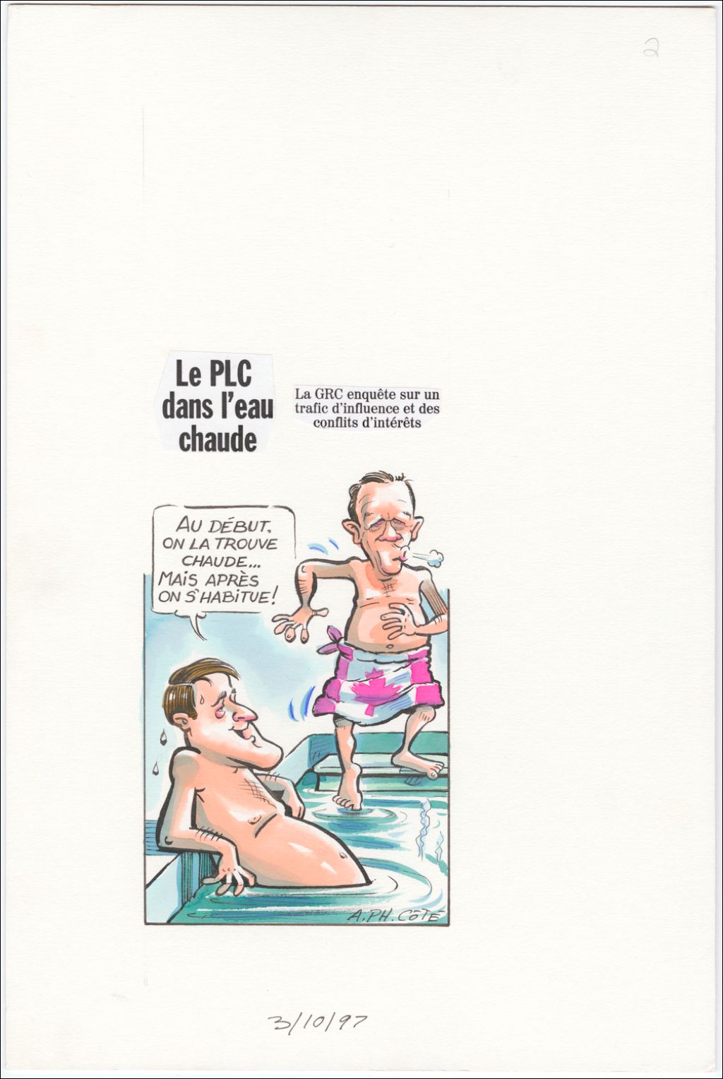 Le PLC dans l'eau chaude. La GRC enquête sur un trafic d'influence et des conflits d'intérêts. [Brian Mulroney] : « Au début, on la trouve chaude… mais après on s'habitue ! »[Jean Chrétien et Brian Mulroney se baigne. La serviette que Jean Chrétien a autour de sa taille est un drapeau du Canada.], 3 octobre 1997, Archives nationales à Québec, Fonds André-Philippe Côté, (03Q,P687,S1,P97-10-03), André-Philippe Côté.