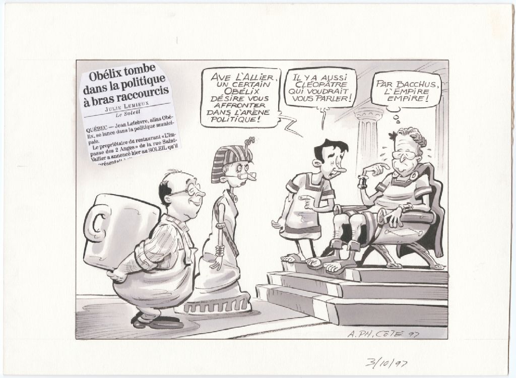 Obélix tombe dans la politique à bras raccourcis. [Homme] : «Ave L'Allier, un certain Obélix désire vous affronter dans l'arène politique ! » « Il y a aussi Cléopâtre qui voudrait vous parler ! » [Jean-Paul L'Allier songe] : « Par Bacchus, l'Empire empire ! », 3 octobre 1997, Archives nationales à Québec, Fonds André-Philippe Côté, (03Q,P687,S1,P97-10-03-1), André-Philippe Côté.