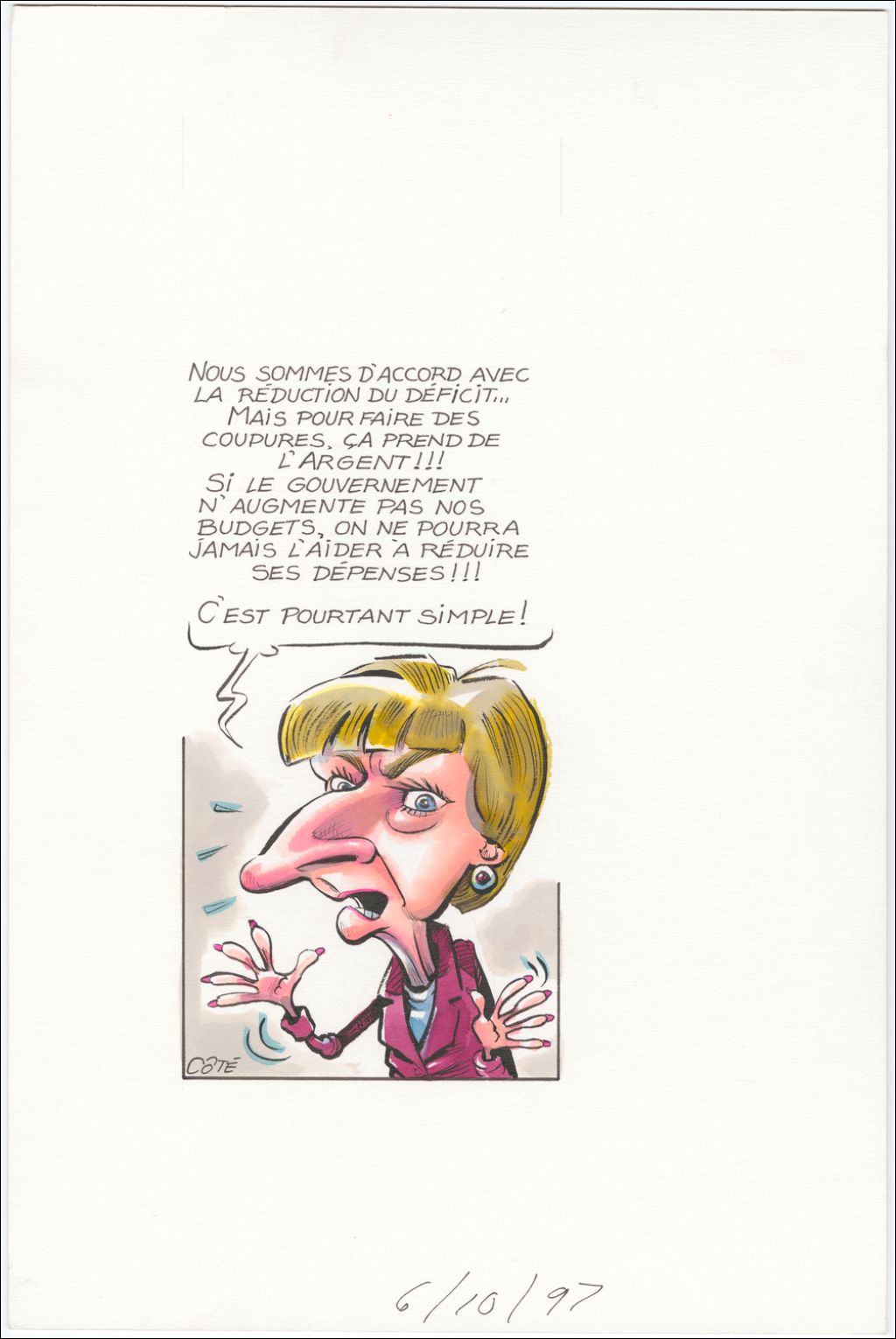 [Lorraine Pagé] : « Nous sommes d'accord avec la réduction du déficit… mais pour faire des coupures, ça prend de l'argent !!! Si le gouvernement n'augmente pas nos budgets, on ne pourra jamais l'aider à réduire ses dépenses !!! C'est pourtant simple ! », 6 octobre 1997, Archives nationales à Québec, Fonds André-Philippe Côté, (03Q,P687,S1,P97-10-06), André-Philippe Côté.