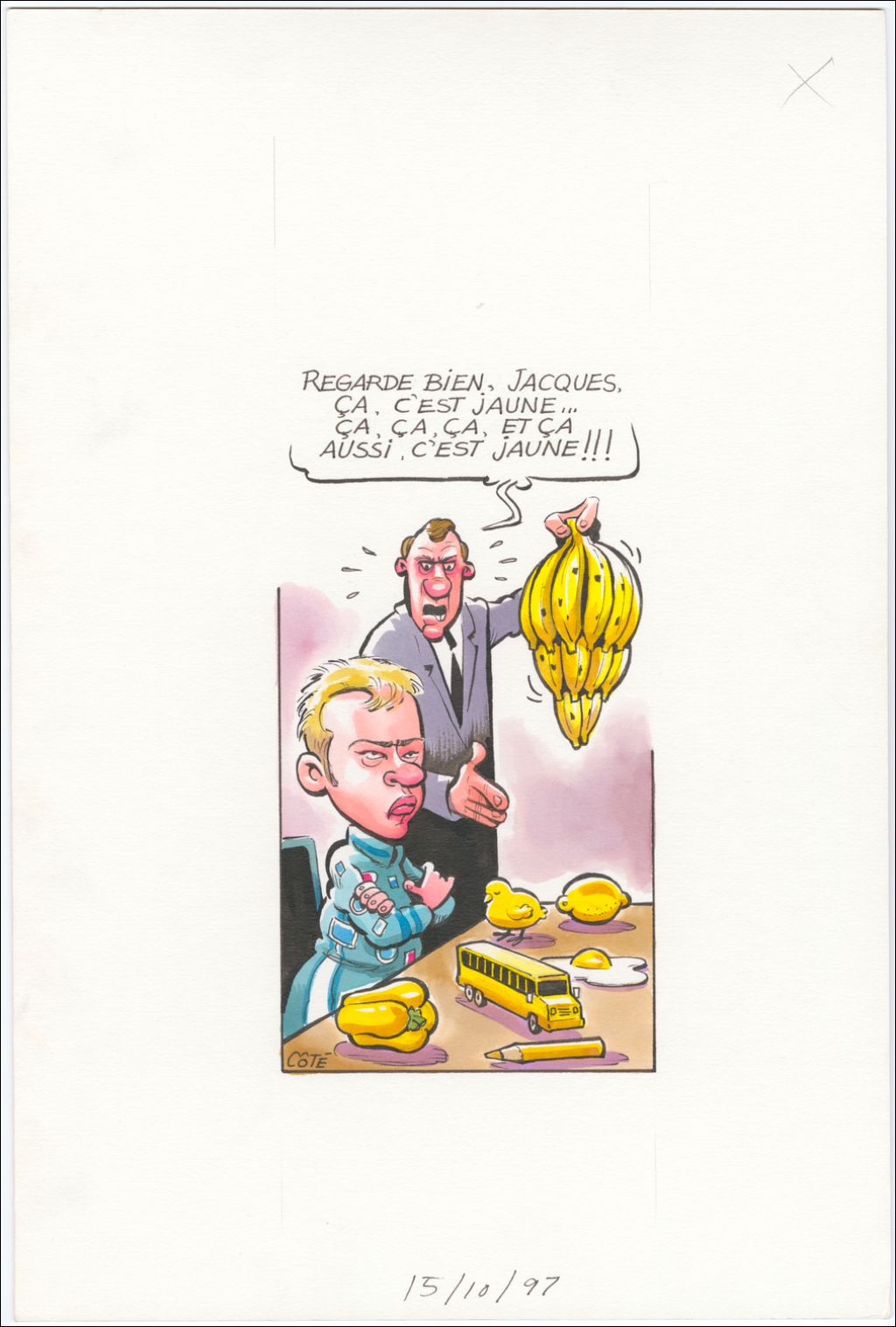 [Craig Pollock, agent] : « Regarde bien, Jacques, ça c'est jaune… ça, ça, ça, et ça aussi, c'est jaune !!! » [L'agent de Jacques Villeneuve lui montre ce qui est jaune : bananes, poivron jaune, poussin, œuf, autobus, crayon de couleur et citron.], 15 octobre 1997, Archives nationales à Québec, Fonds André-Philippe Côté, (03Q,P687,S1,P97-10-15), André-Philippe Côté.