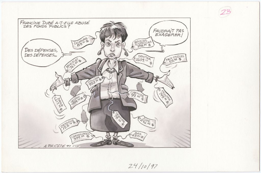 Francine Dubé a-t-elle abusé des fonds publics? [Francine Dubé] : « Des dépenses, des dépenses... [Francine Dubé arbore des étiquettes : coiffure 89.00$, boucles d'oreilles 198,89$, bracelet 767,89$, dentier 1609,77$, faux ongles 59,88$, montre 749,99$, collier 952,99$, veston 489,79$, ceinture 79,99$, chemise 99,99$, jupe 246,95$, bague 1617,99$, dessous 153,79$, chaussures 399,89$, bas 69,99$] » « Faudrait pas exagérer ! »