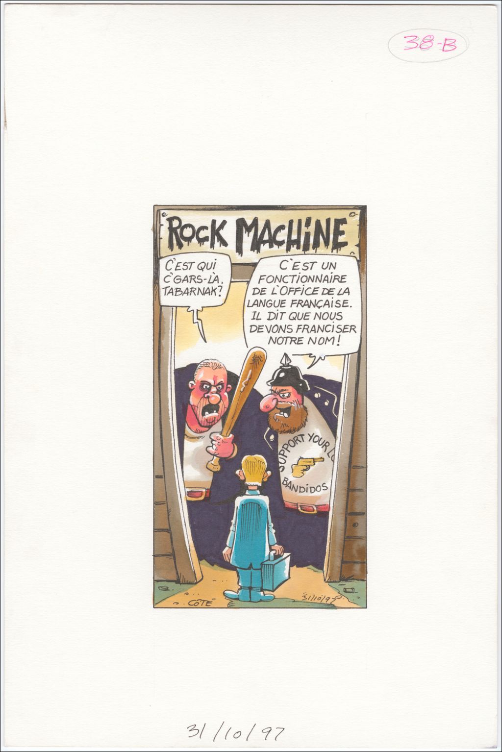 [Deux motards ouvrent la porte] [Motard I] : « C'est qui c'gars-là, tabarnak ? » [Motard II] : « C'est un fonctionnaire de l'Office de la langue française. Il dit que nous devons franciser notre nom ! », 31 octobre 1997, Archives nationales à Québec, Fonds André-Philippe Côté, (03Q,P687,S1,P97-10-31), André-Philippe Côté.