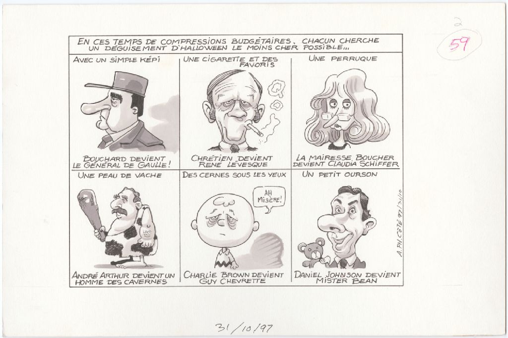 En ces temps de compressions budgétaires, chacun cherche un déguisement d'Halloween le moins cher possible, 31 octobre 1997, Archives nationales à Québec, Fonds André-Philippe Côté, (03Q,P687,S1,P97-10-31-1), André-Philippe Côté.