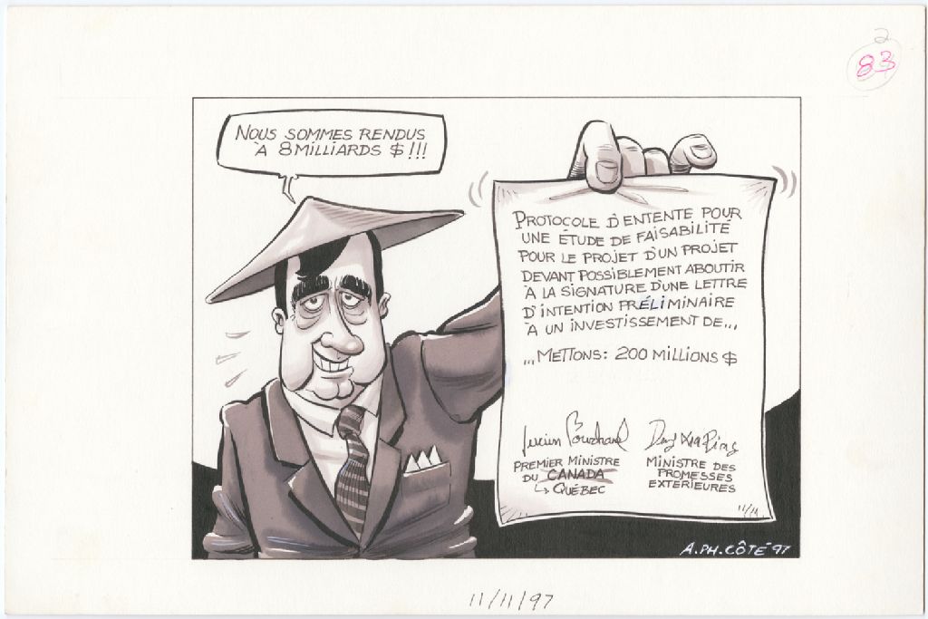 On peut lire sur la feuille que Lucien Bouchard présente :Protocole d'entente pour une étude de faisabilité pour le projet d'un projet devant possiblement aboutir à la signature d'une lettre d'intention préliminaire à un investissement de ¿,,, Mettons : 200 millions $La lettre est signée par Lucien Bouchard, premier ministre du Québec (Il a rayé Canada) et Deng Xiaoping, ministre des promesses extérieuresDeng Xiaoping est décédé en février 1997
