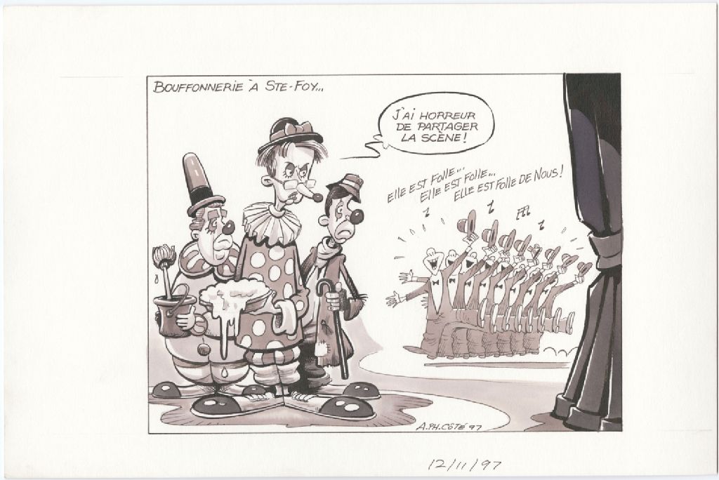 Bouffonnerie à Ste-Foy… [Andrée Boucher] : "J'ai horreur de partager la scène!", 12 novembre 1997, Archives nationales à Québec, Fonds André-Philippe Côté, (03Q,P687,S1,P97-11-12), André-Philippe Côté.