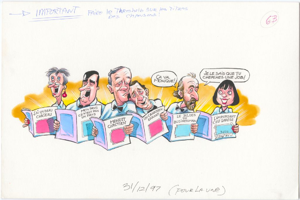 On peut voir plusieurs politiciens chantant chacun sa partition.Andrée P. Boucher : J'ai un beau châteauLucien Bouchard : Mon pays ce n'est pas un paysJean Chrétien : Minuit ChrétienDaniel Johnson Fils : Un Canadien errantGérald Larose : Le blues du businessmanMonique Simard : L'important c'est Larose