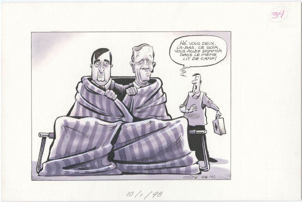 [Lucien Bouchard et Jean Chrétien face à la crise] "Hé, vous deux, là-bas, ce soir, vous allez dormir dans le même lit de camp!"