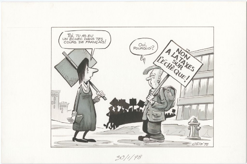 [Femme] : "Toi, tu as eu un échec dans tes cours de français!" [Étudiant tenant un pancarte NON A LA TAXES SUR L'ÉCHÈQUE!] : "Oui pourquoi?"
