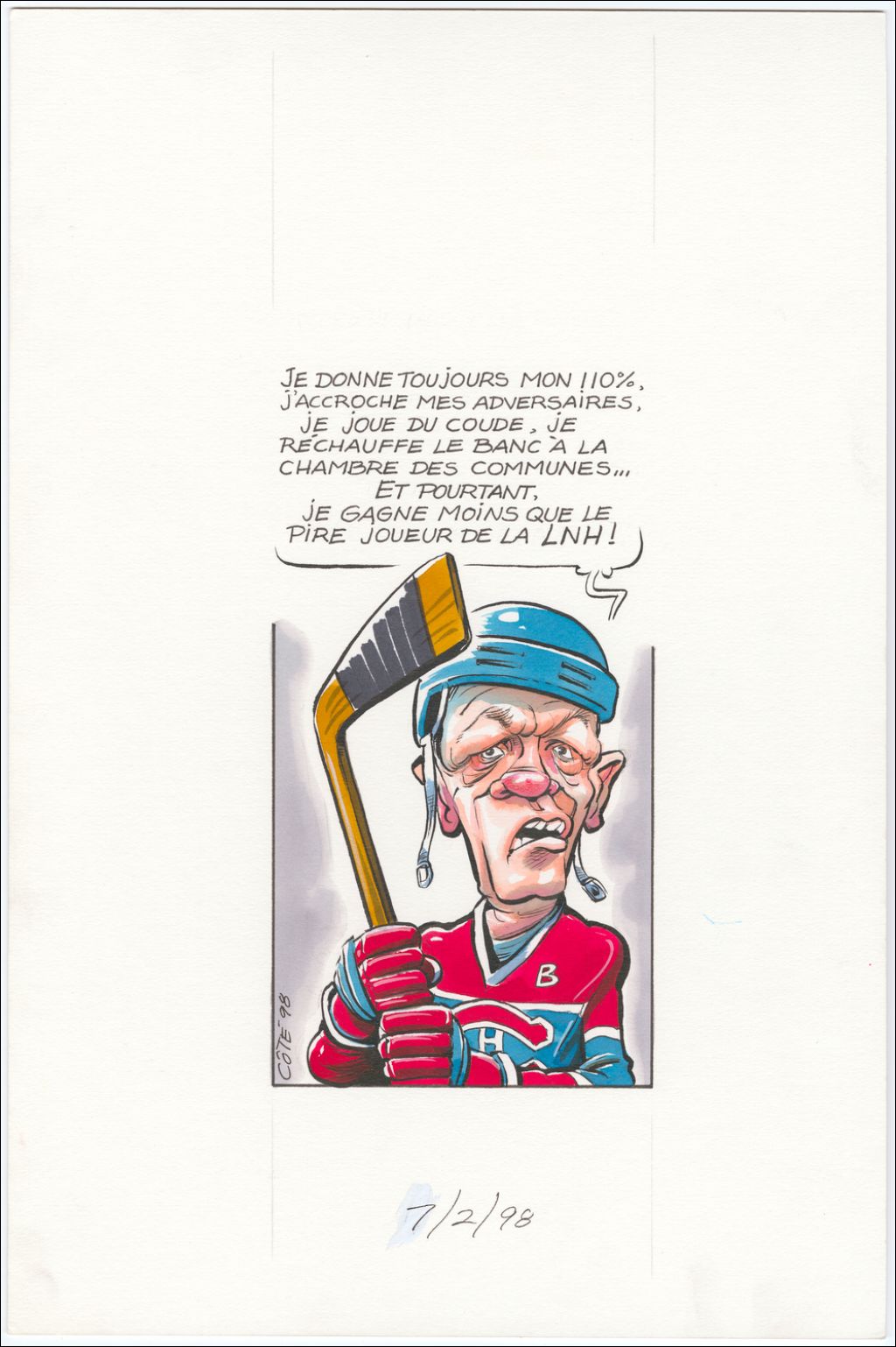 [Chrétien] : " Je donne toujours mon 110%, j'accroche mes adversaires, je joue du coude, je réchauffe le banc à la chambre des communes… Et pourtant, je gagne moins que le pire joueur de la LNH!", 7 février 1998, Archives nationales à Québec, Fonds André-Philippe Côté, (03Q,P687,S1,P98-02-07), André-Philippe Côté.