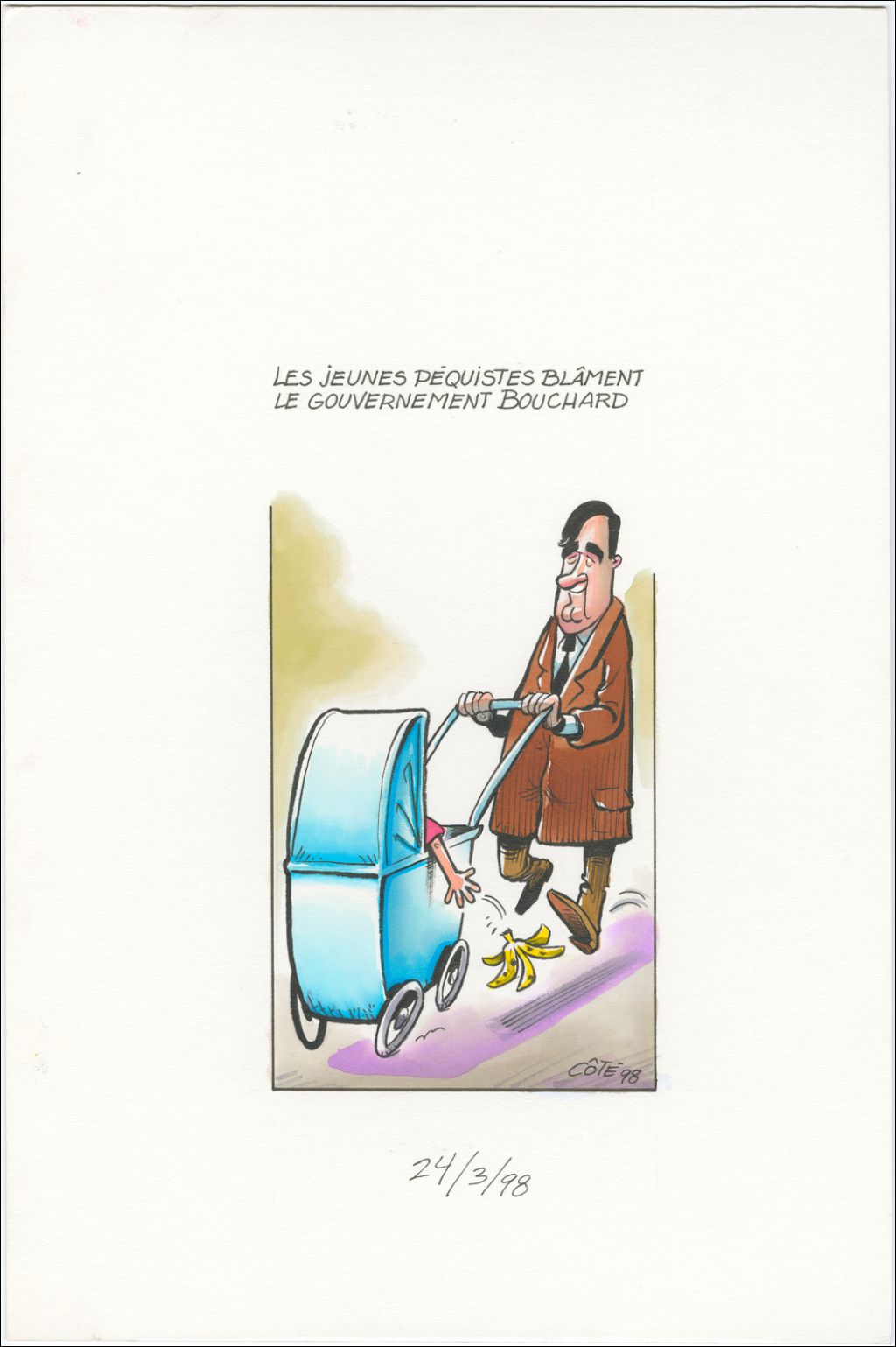 Les jeunes péquistes blâment le gouvernement Bouchard [Lucien Bouchard pousse un carosse et le bébé lui lance une peau de banane]
