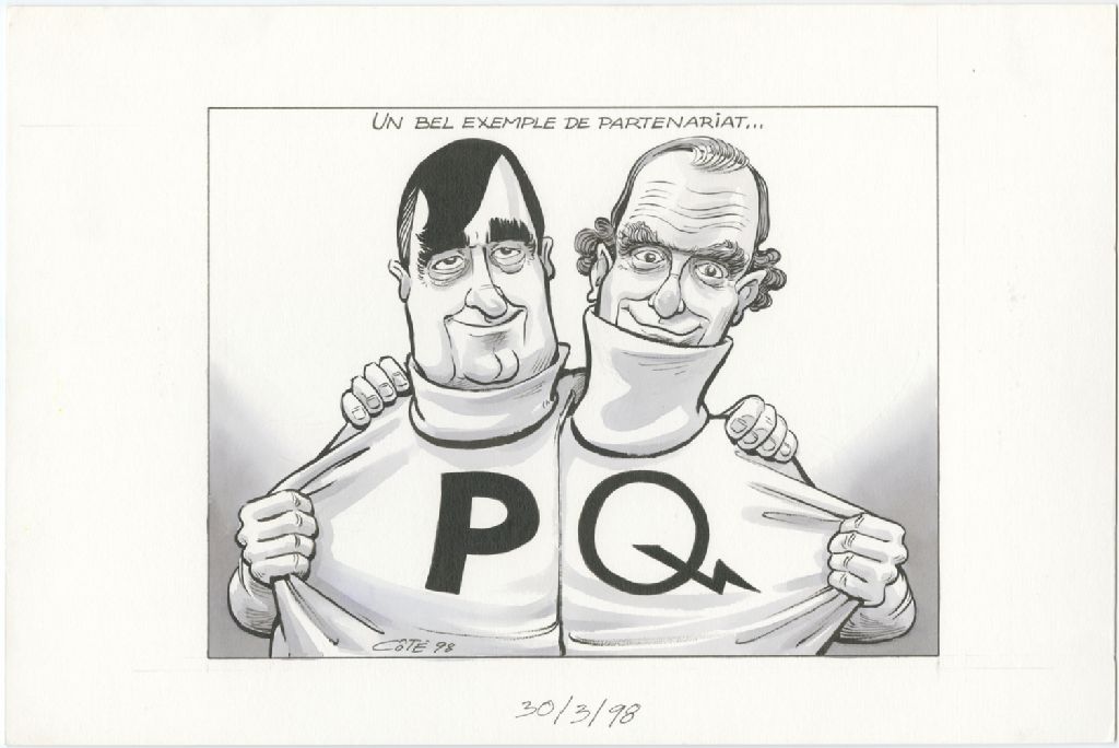 Un bel exemple de partenariat… [Lucien Bouchard et André Caillé portent des chandail avec les lettres "P" et "Q"]
