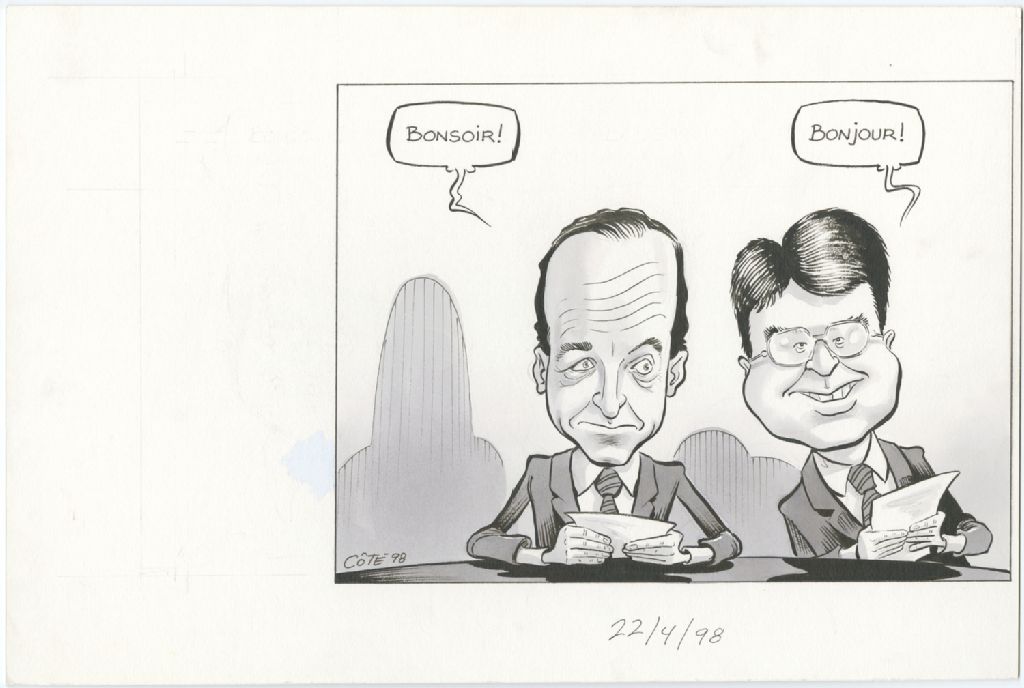 [Bernard Derome] : "Bonsoir" [Stéphane Bureau] : "Bonjour!"