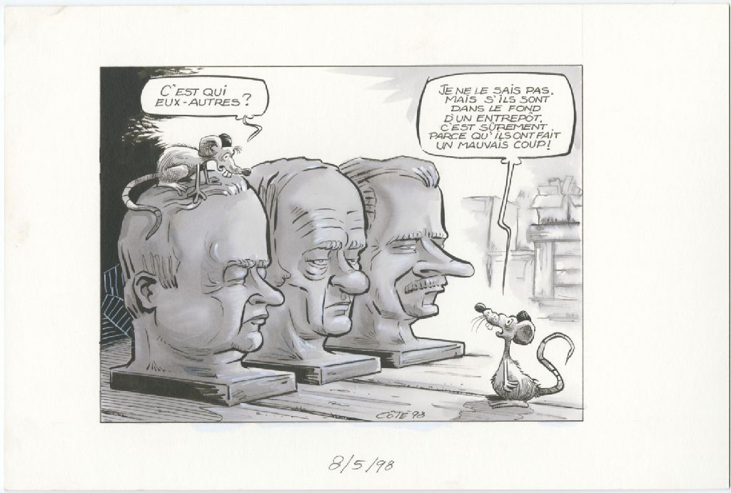 [Souris] : "C'est qui eux-autres?" [Souris] : "Je ne le sais pas, mais s'ils sont dans le fond d'un entrepôt c'est sûrement parce qu'ils ont fait un mauvias coup!", 8 mai 1998, Archives nationales à Québec, Fonds André-Philippe Côté, (03Q,P687,S1,P98-05-08-1), André-Philippe Côté.