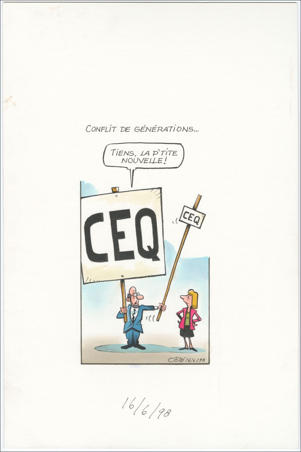 Conflit de générations… [Homme] : "Tiens, la p'tite nouvelle!", 16 juin 1998, Archives nationales à Québec, Fonds André-Philippe Côté, (03Q,P687,S1,P98-06-16-1), André-Philippe Côté.