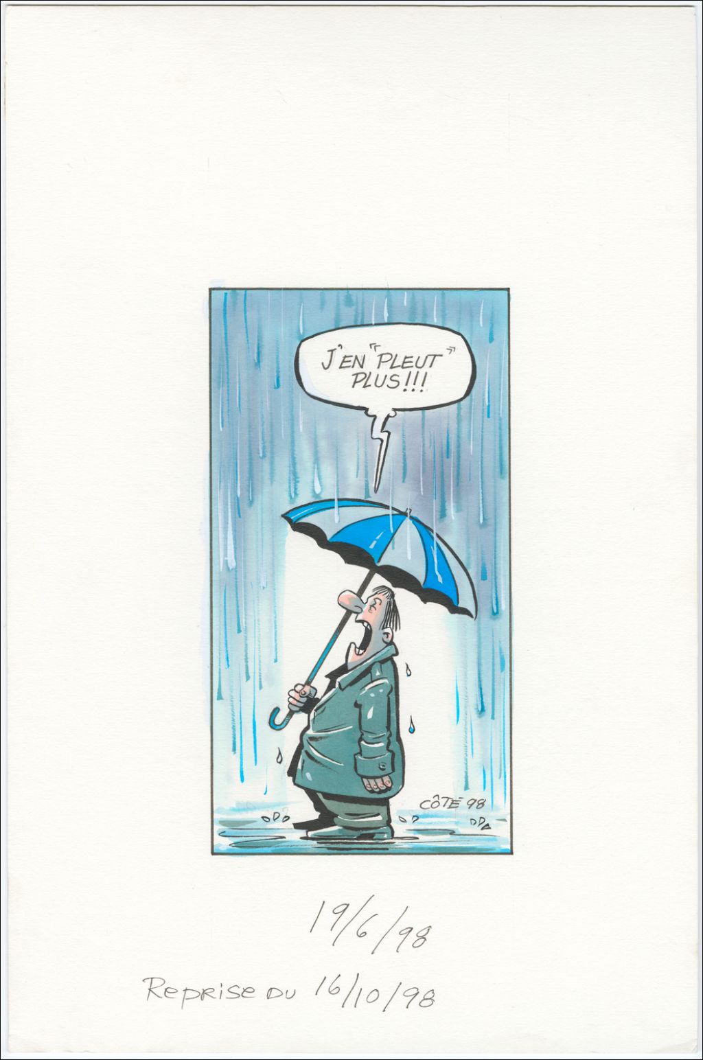 [Homme] : « Je n'en "pleut" plus !!! » [Il pleut et l'homme est sous son parapluie], 19 juin 1998, Archives nationales à Québec, Fonds André-Philippe Côté, (03Q,P687,S1,P98-06-19), André-Philippe Côté.