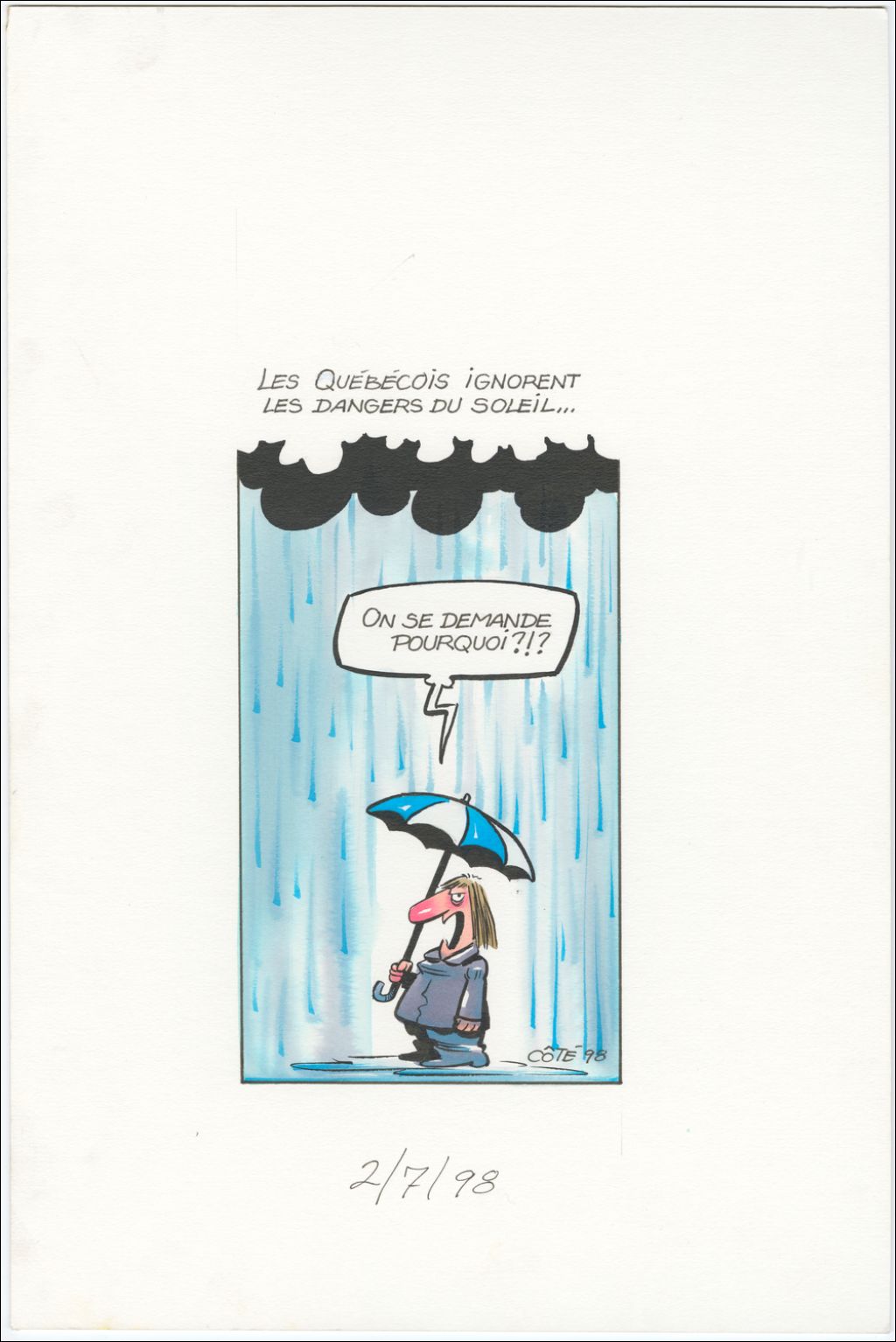 Les québécois ignorent les dangers du soleil… [Femme sous un parapluie à la pluie battante] : « On se demande pourquoi ?!? »